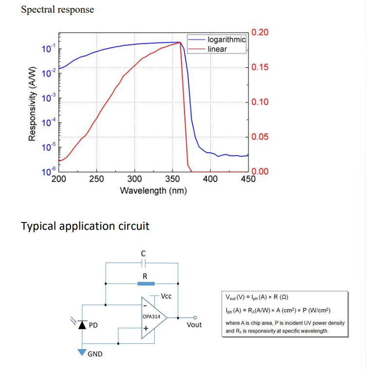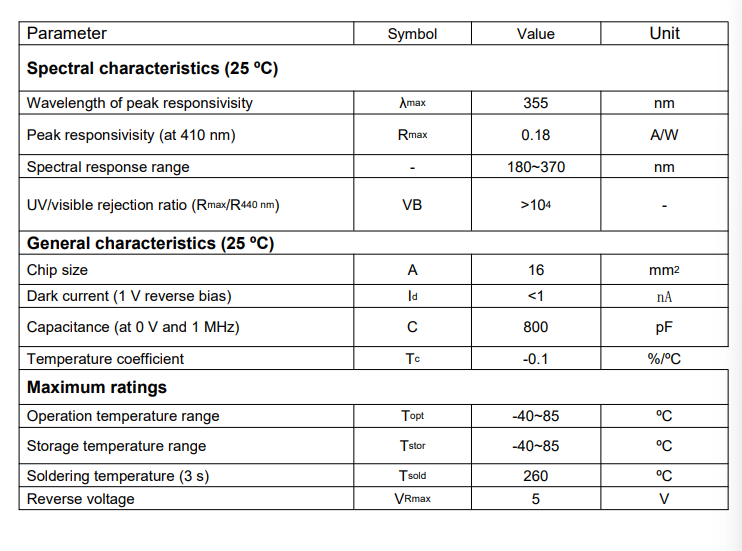 宽带GaN基紫外光电二极管,针对紫外范围180~370nm、UVC+UVB+UVA波长进行了优化。可以通过内置过滤器轻松选择。它被包装在带有石英窗的电隔离和密封的TO-39金属罐中。