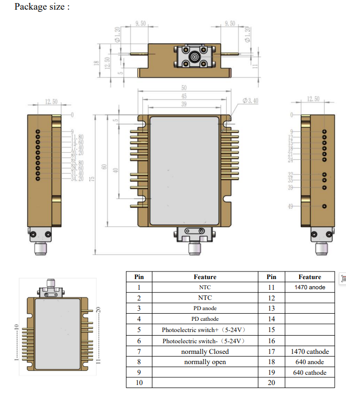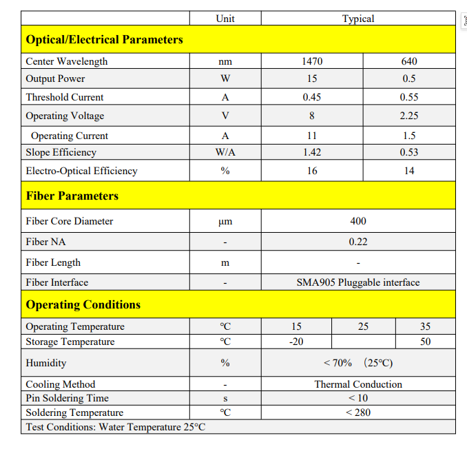 1470nm 15W光纤耦合输出半导体激光器模块这种1470nm双波长激光模块,二极管激光治疗装置,旨在在手术过程中以接触和非接触模式向软组织输送激光。Feature :Wavelength 1470nmFiber output power 15WFiber core diameter 400μm with 3mm Spiral soft armorOptical fiber numerical aperture 0.22NA